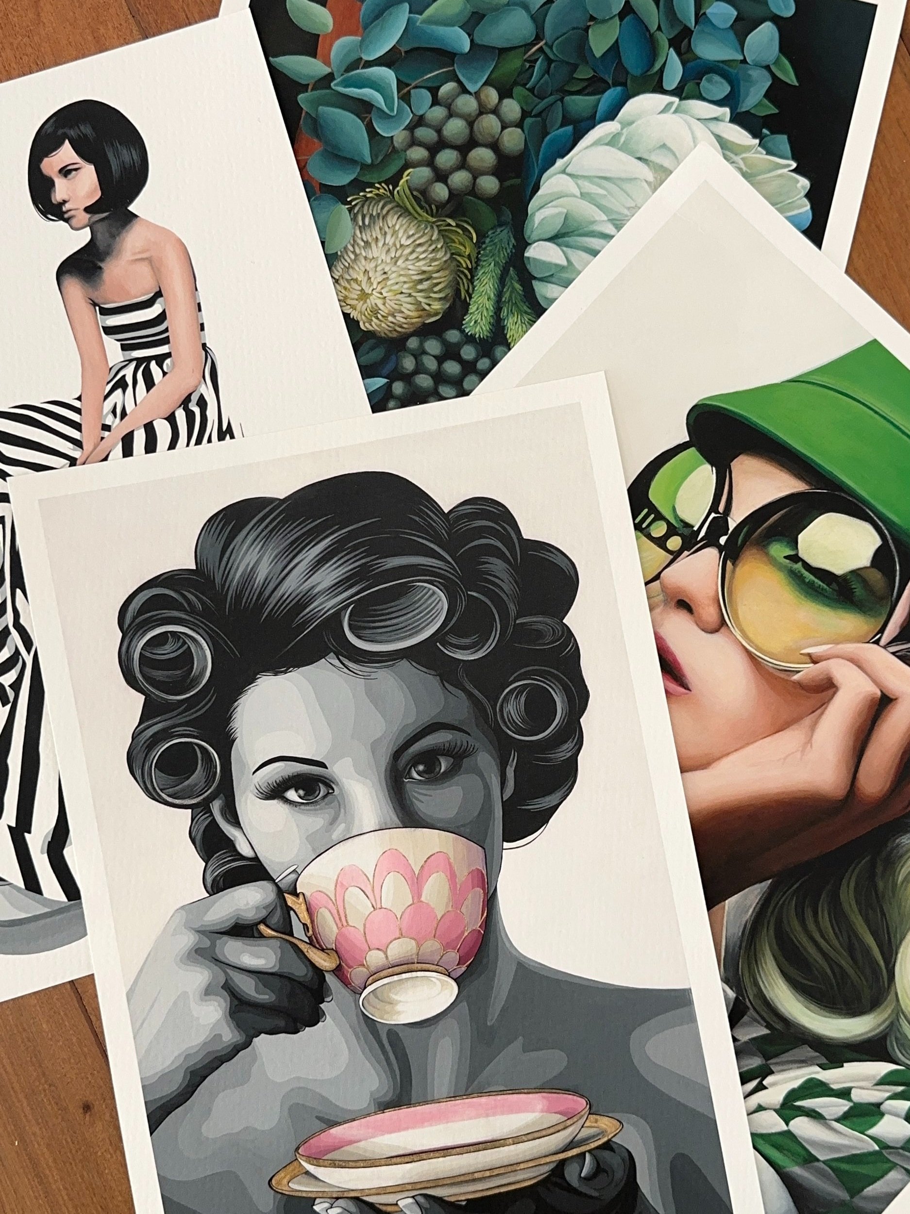 This artwork presents a striking and visually compelling portrait of a woman holding a delicate teacup. The predominant use of grayscale for the figure contrasts sharply with the vibrant colours of the teacup and saucer, drawing immediate attention to these objects.